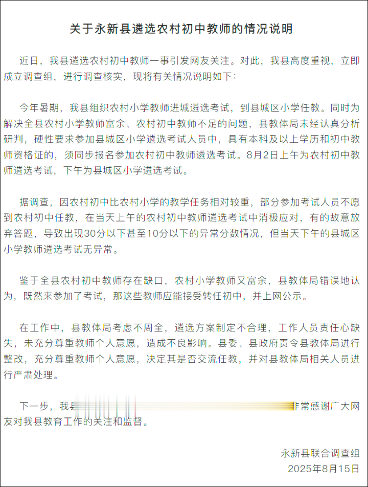 永新县教体局介绍,按2025年永新县选调实施方案的规定,在县城初中录取完后,农村初中从小学教师已报考初中教师岗位剩下的人选中按比例从高分到低分录取,本次报名参加选调初中的教师均具有本科以上学历,并取得初中及以上教师资格证,符合选调初中的条件,本次录取按照“公开、公平、竞争”的原则,严格按《2025年永新县公开选调农村教师进城任教及农村小学到农村初中任教的实施方案》的规定执行,没有对任何一位考生有特殊的关照。
